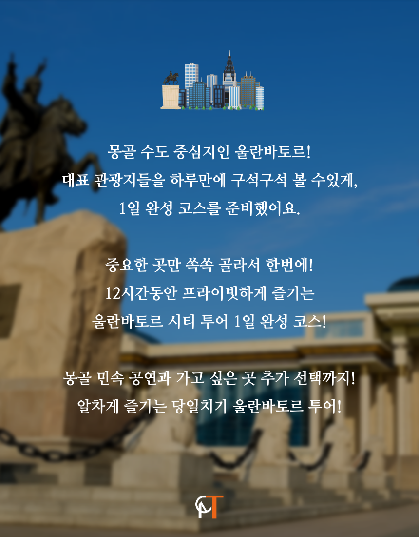 약 12시간동안 알차게 즐기는 당일치기 울란바타르 시티 투어 1일 여행.