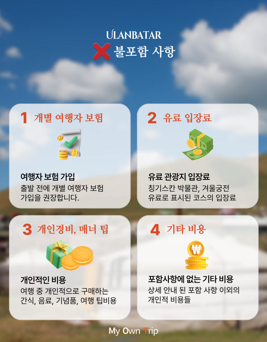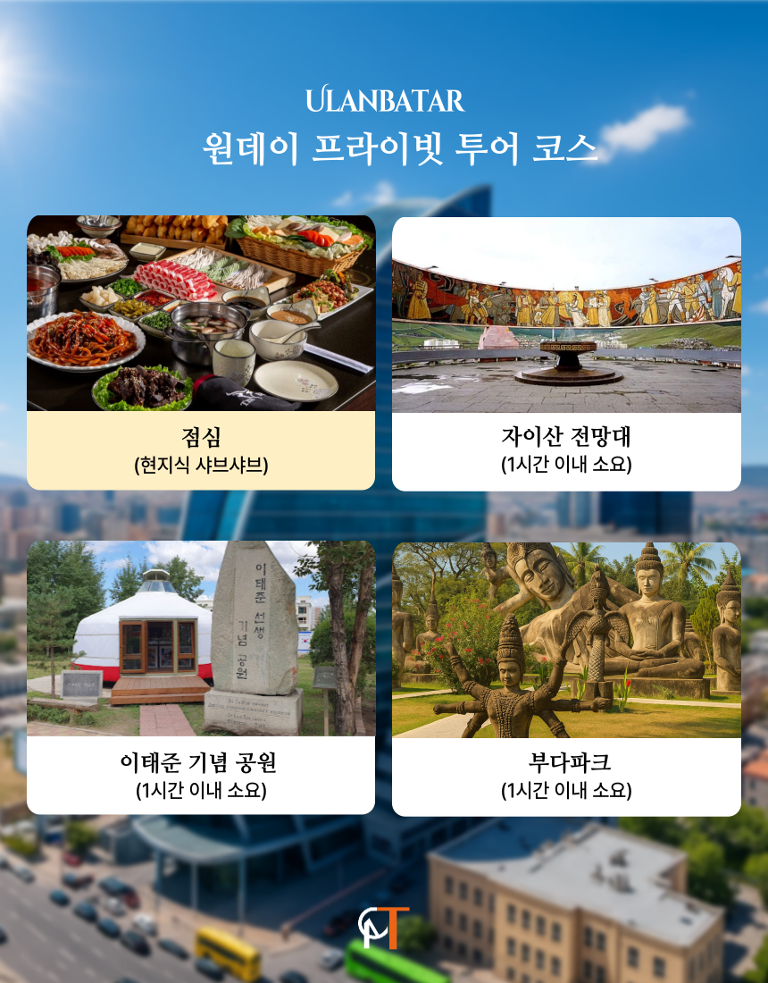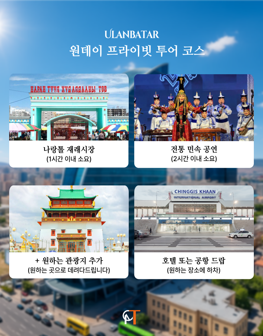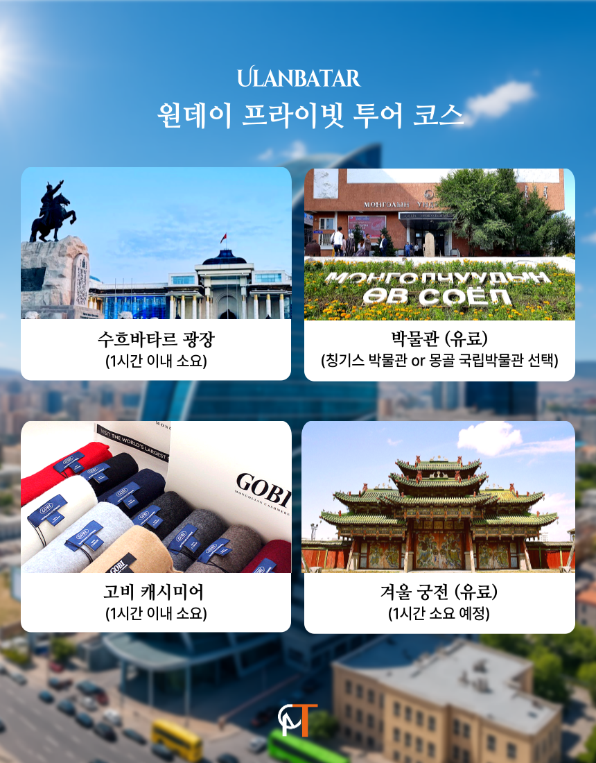 - 울란바토르 / 전통공연 / 몽골 샤브샤브 / 자이산 / 나랑톨마켓 / 복드칸 겨울궁전 / 칭기스칸 박물관