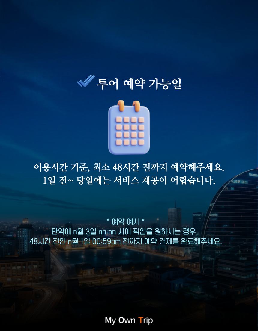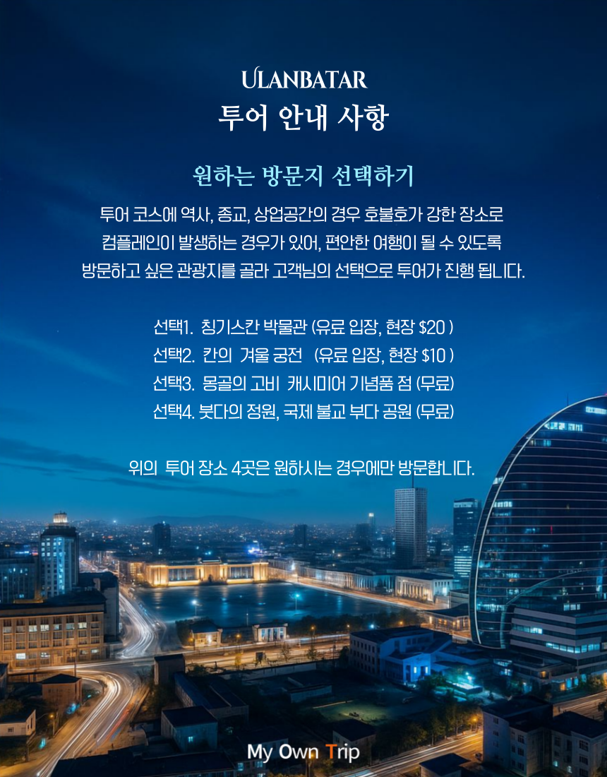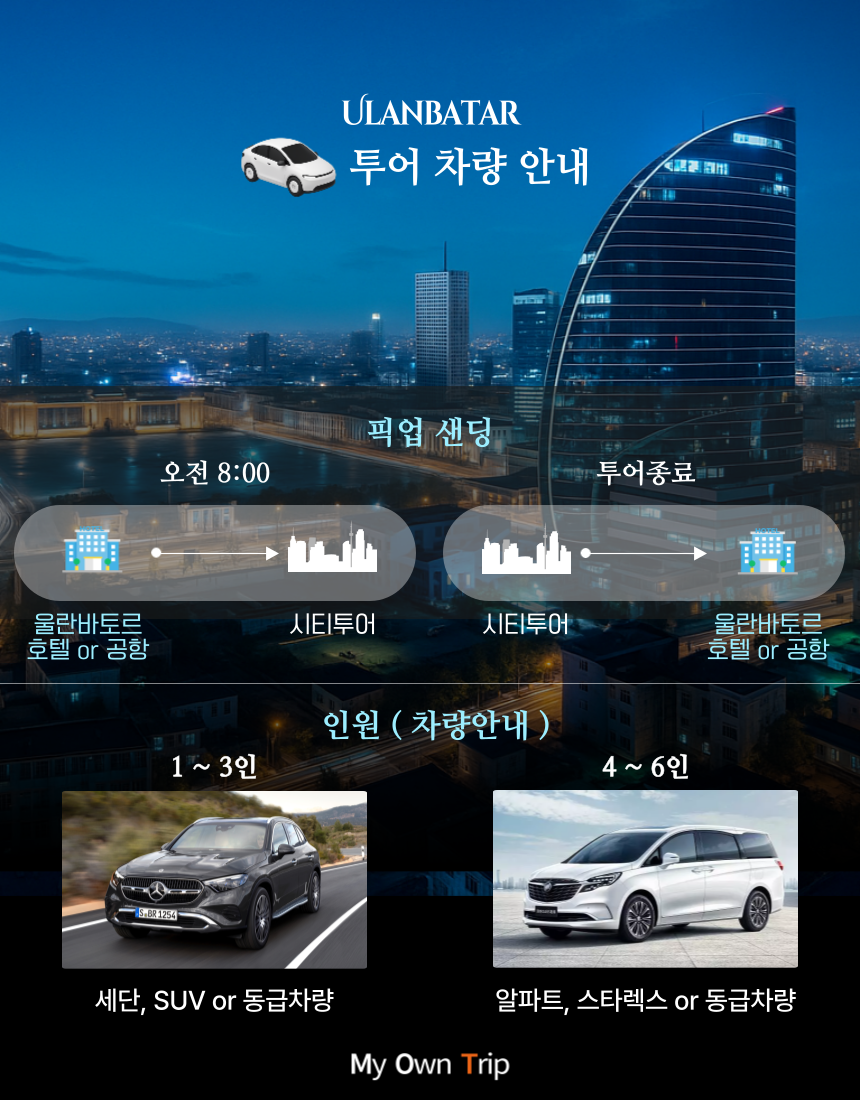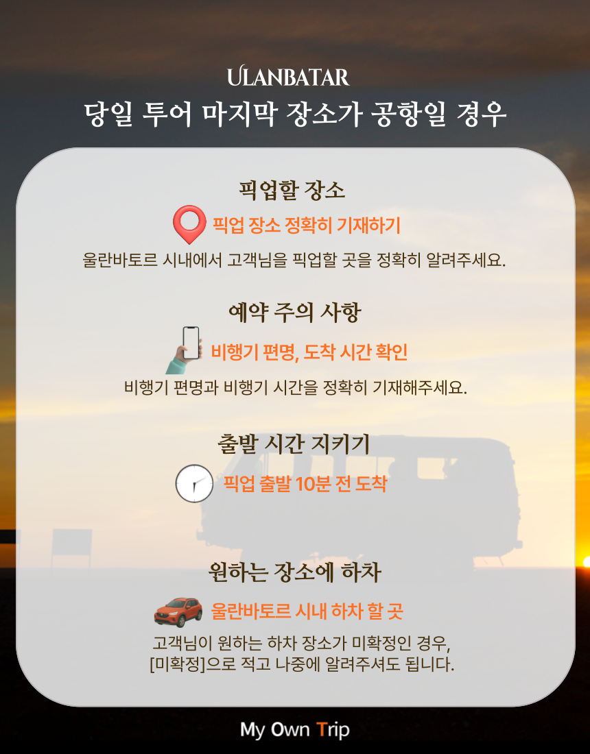 (4) 울란바토르 시내에서 픽업/드랍(하차) 장소는 고객님이 원하시는 장소를 기재해주세요.